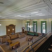 The courthouse was originally built without a cooling system and the structural elements precluded most types of HVAC equipment. A Mitsubishi City-Multi VRF system was selected to minimize penetrations through walls and floors and provide almost completely silent cooling to the courtroom. Heating in the courtroom is now provided by fin-tube convectors, in place of the original recessed radiators, with custom cut front grilles that completely disguise the equipment. New electronically controlled lighting and window treatments add to the energy management program. Alamance County reports this is the most energy efficient building the county owns.